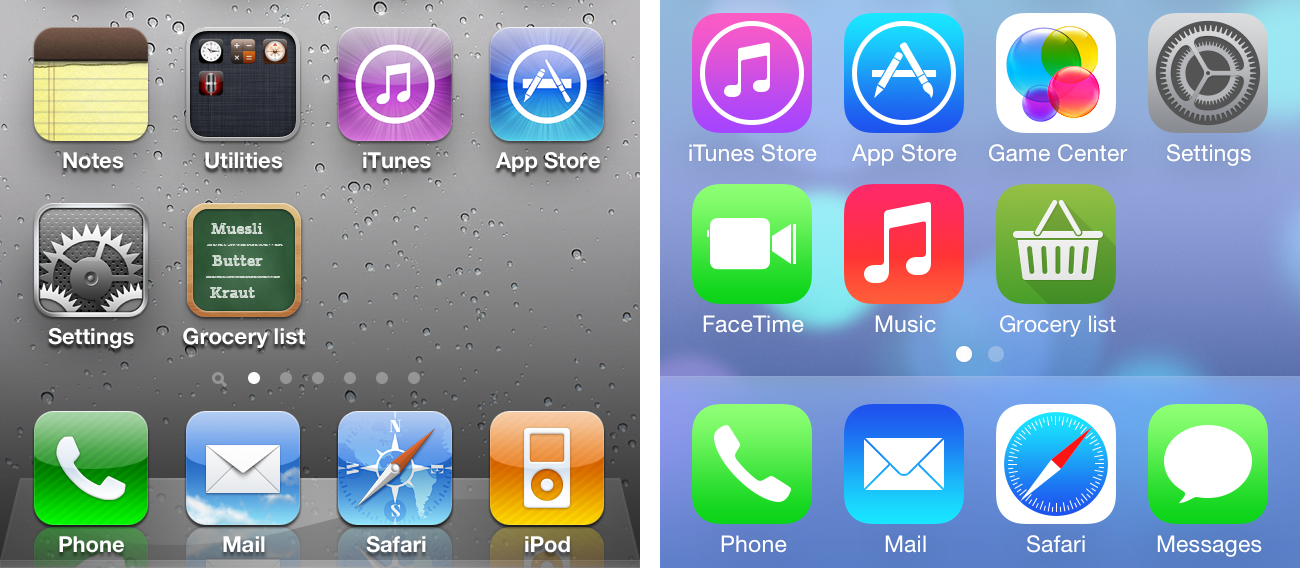 Not only has Apple changed the dimensions and outlines of the app icons in iOS 7, it has also changed the visual mood. App icons don't have an applied glow anymore, and most of the build-in app icons fit in the grid Apple has shown. Also, the icons are much simpler, removing the realistic effects and mostly only displaying simple symbolics on a colorful background. This is a transition away from little photorealistic illustrations toward the basic meaning of what an icon should be: Iconographic.