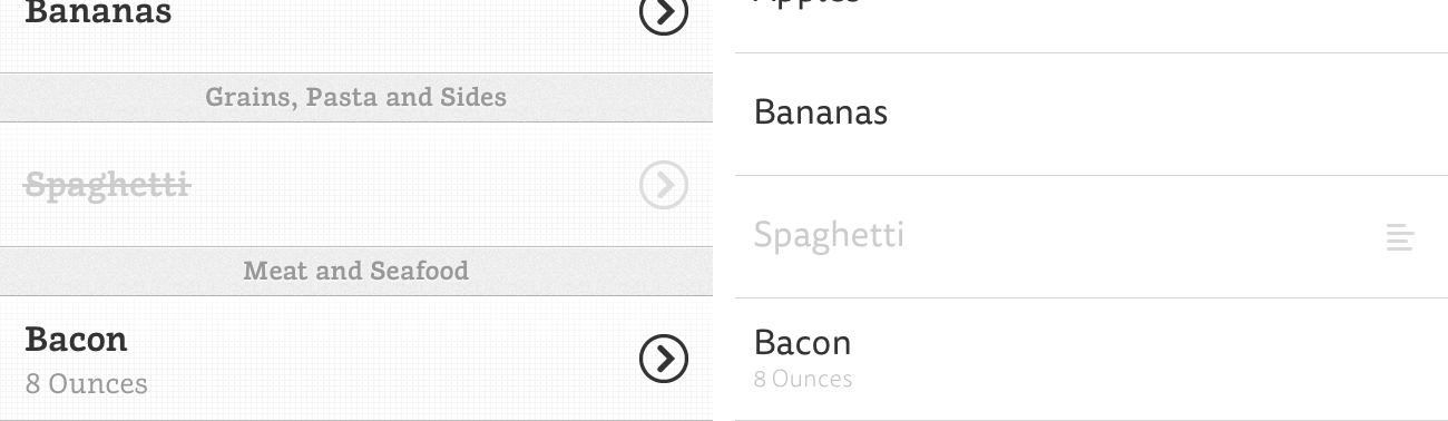 In Grocery List , we use a slab-serif that matches the skeuomorphic style. Running the app on an iOS 7 device has shown that this font is not the best choice for the next version. We decided to use a custom, sans-serif font that could better support the overall appearance of our app than the default one could.