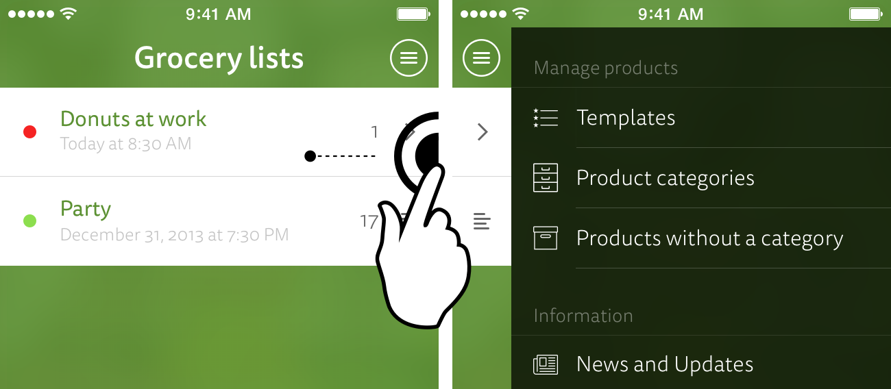 In Grocery List , we didn't have any custom gestures. But for our goal to improve some workflows in the next version, we support swiping on a cell from both directions to present different options for a product. And instead of having to go back your navigation stack to get to your lists or templates, you can easily swipe from the right device edge to quickly access the menu.