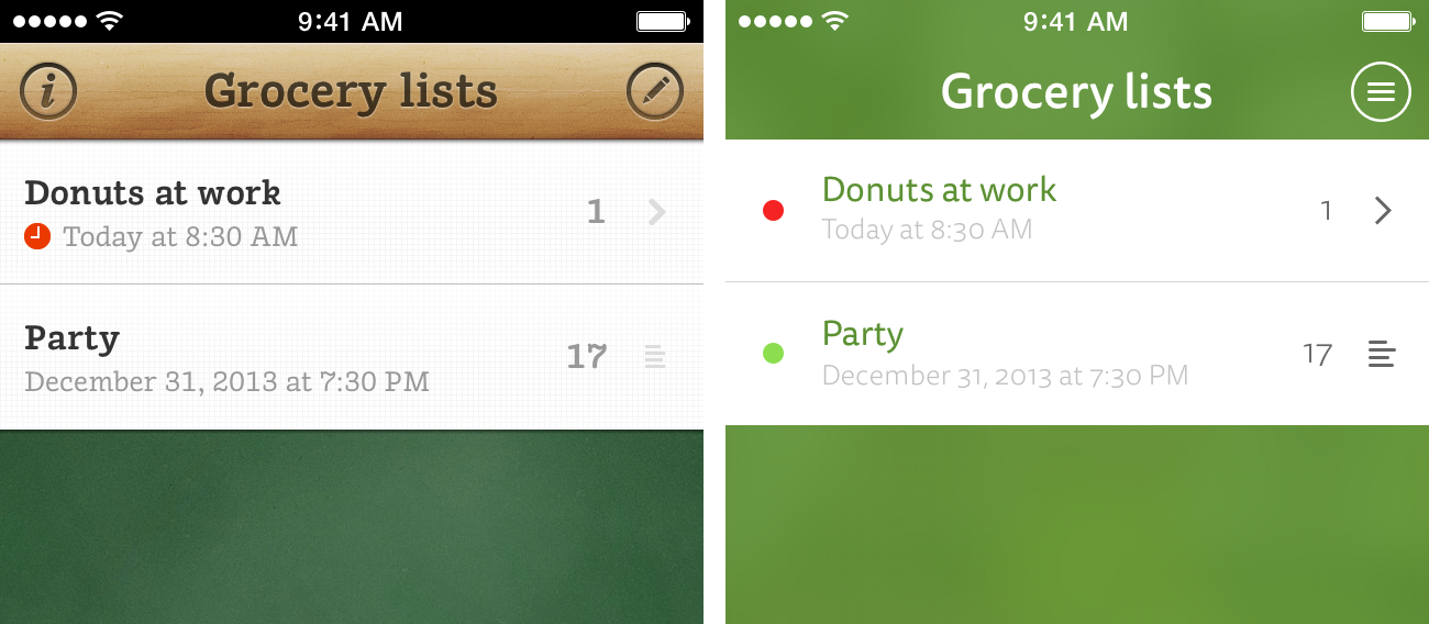 Watching the WWDC presentation of the new version of iOS, we were looking at our app Grocery List and realized: This iOS version is a complete restart, like the first introduction of the iPhone seven years ago. It's not enough to simply change the design. We had to rethink and rebuild the application to fit within the new environment. So we did.